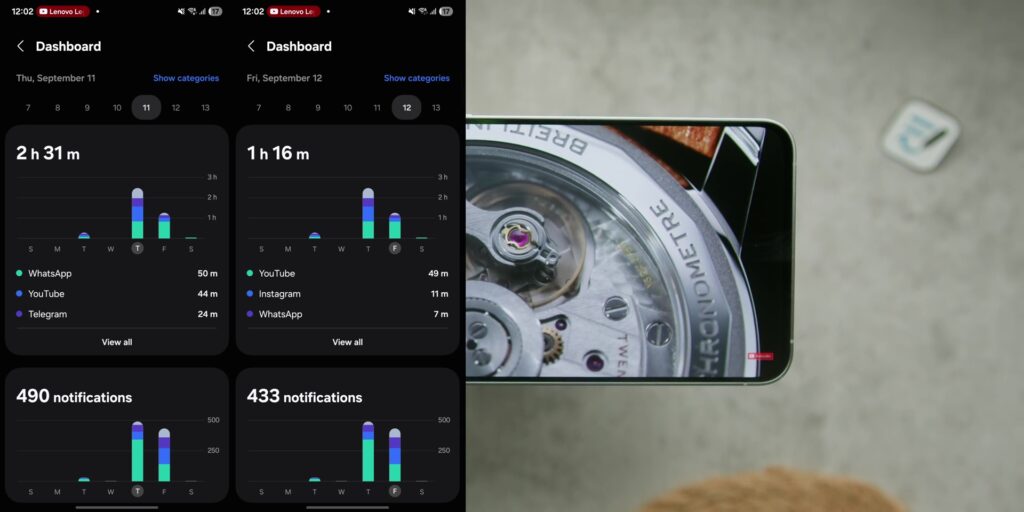 While that doesn’t sound like a lot, but again, the software optimization takes this through 2 days where the initial battery drain was about 47 minutes for the first 10%, which was way better than something like the Google Pixel 10 where in the middle of the day I was still getting 2 and 1/2 hours at 59% battery life.
